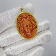Antike Brosche, Anhänger, Korallen-Kamee, 18 Karat Gold, weibliches Portrait, Kameo, Cameo